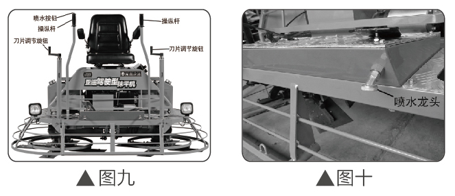 ③ 水泵開關裝在右手操作桿頂端,只要一按水泵開關按鈕,水泵就會自動噴水。(見圖九、圖十)我們建議參照我們制定的檢查標準對機器進行檢查。每天檢查項目(工作5-10小時后):檢查變速箱渦輪蝸桿油是否有損耗(如圖二);檢查引擎潤滑油是否有損耗(如圖三);檢查電器線路是否有問題。(機器上的計時器可以提供工作時間)