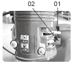 注意 如果發動機是冷卻,關上風門;如果發動機是熱的,則打開風門。在冷機啟動時把風門往后拉(關),預熱完成后向前推(開),拉動油門機器開始工作。(見右圖01位)